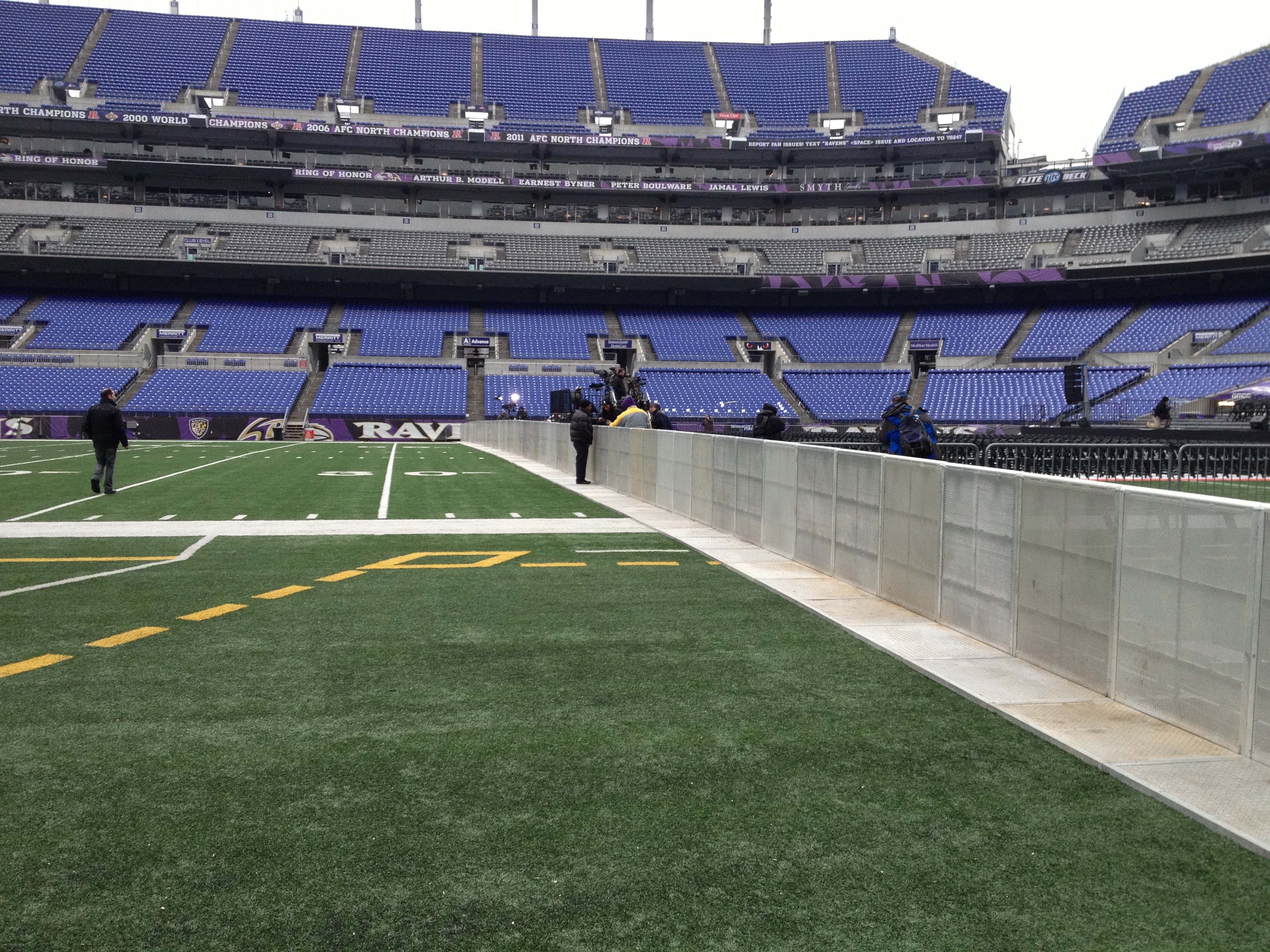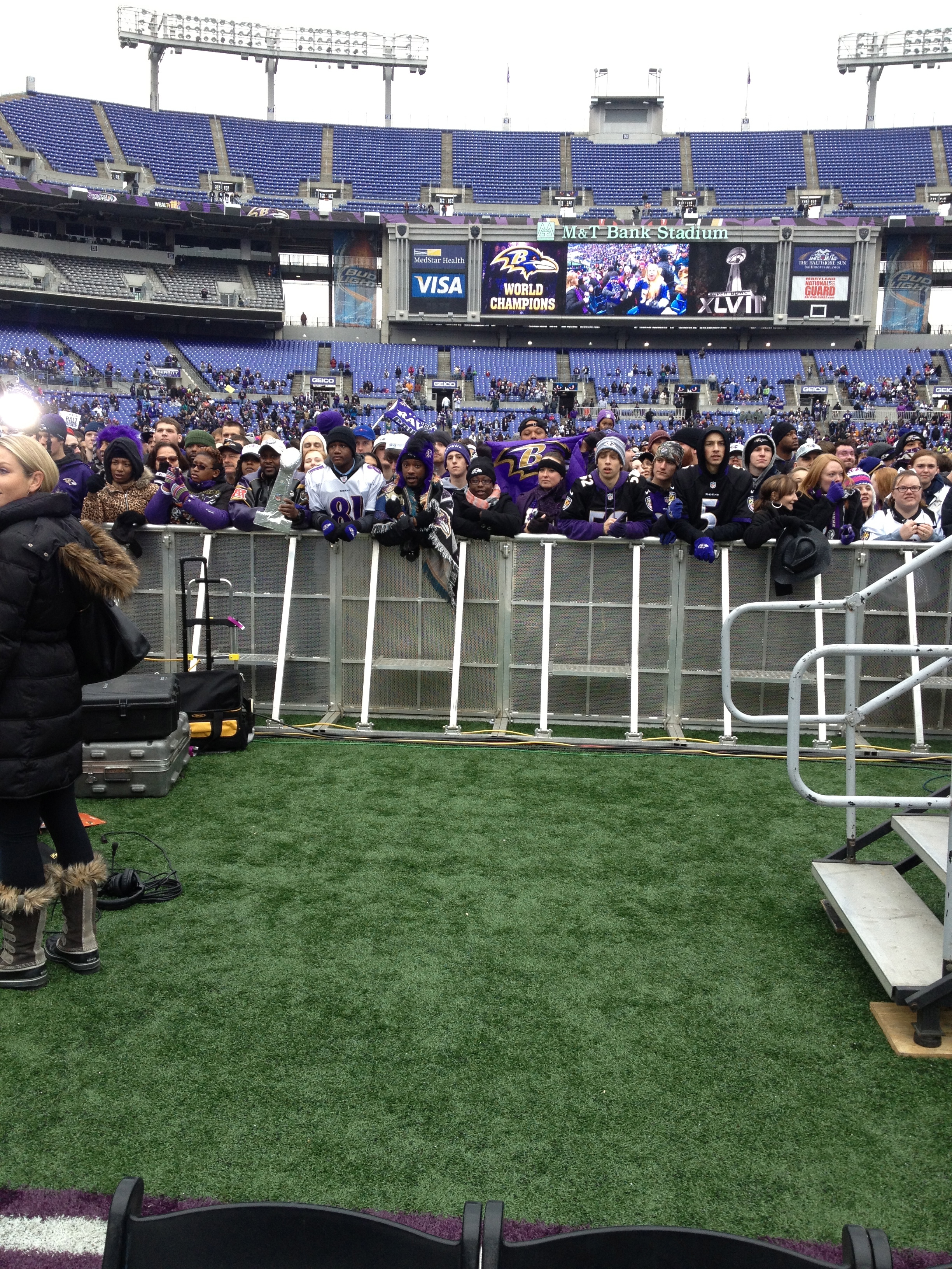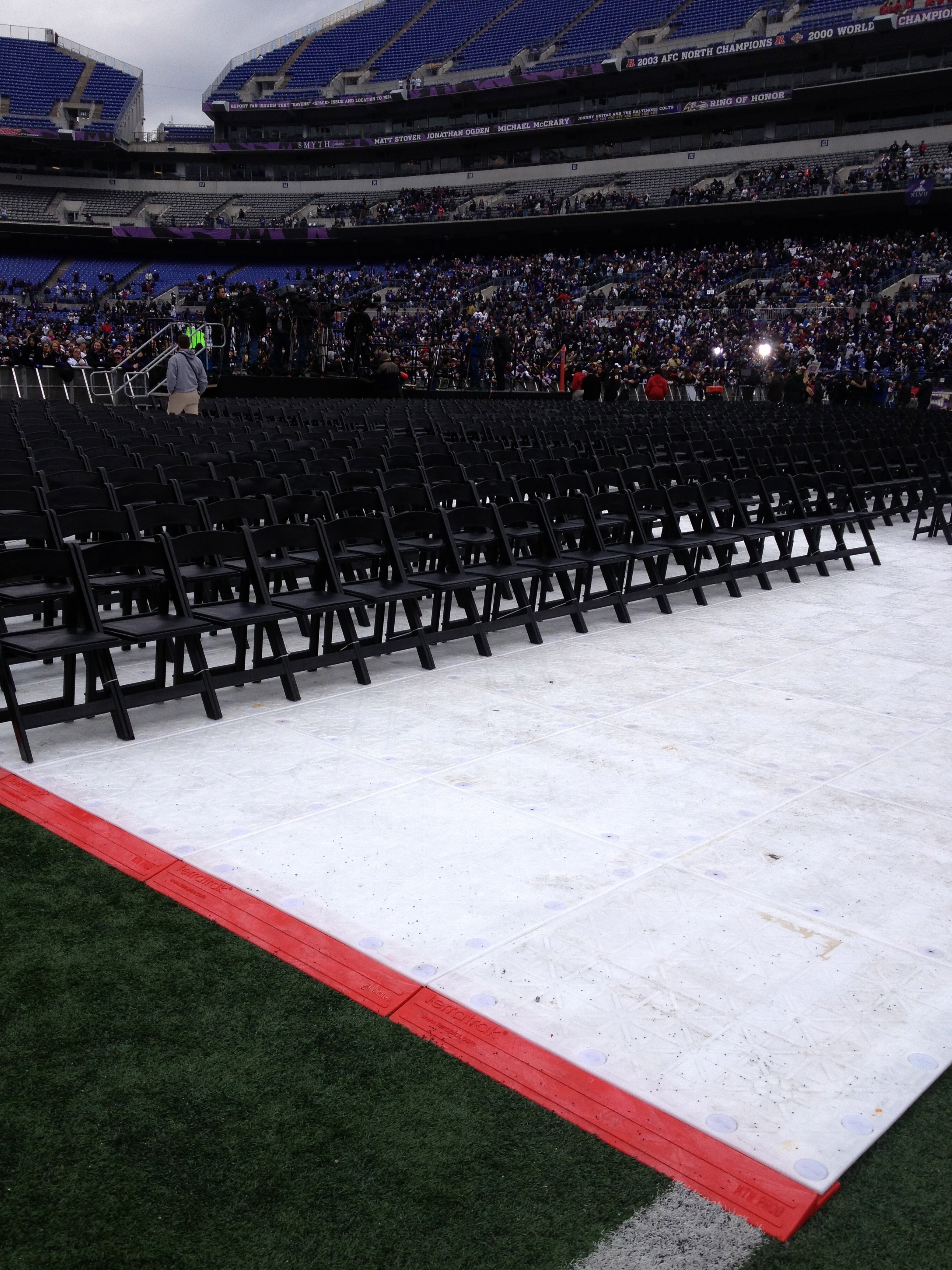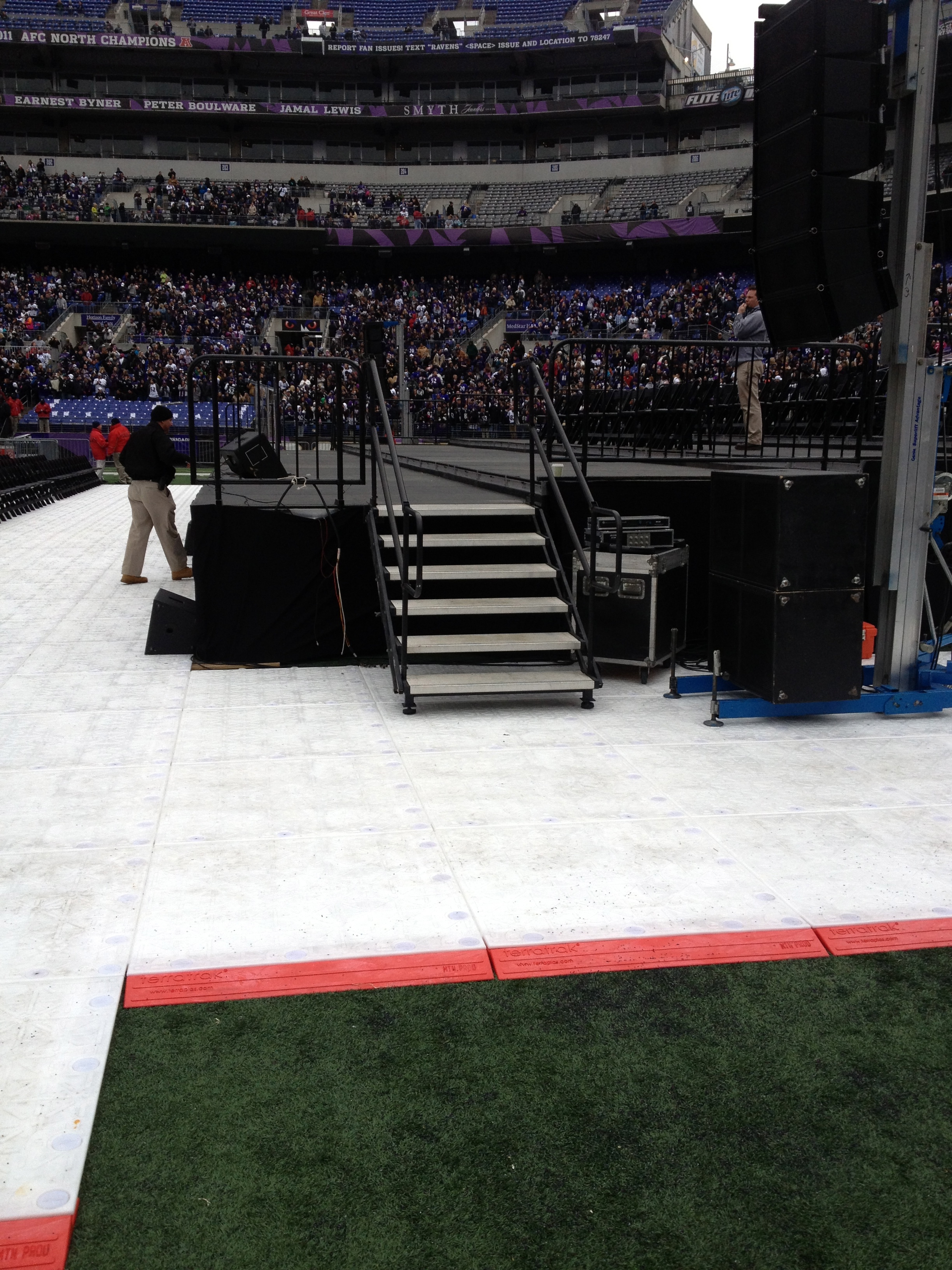 The stage setup allowed for optimal viewing from all seats. The high energy celebration needed a way to control the diehard fans, and Mountain’s aluminum crowd control barricade was a perfect solution, providing durability and acoustic transparency. To protect the turf from damage, Terratrak was laid down on top of the field. Terratrak is a great groundcover product that can withstand extremely heavy vehicle traffic. The interlocking panels create a continuous surface free from gaps. Below are some pictures from inside of M&T Bank Stadium. Congratulations to the Ravens, and a big thanks for letting us play a part in this celebratory event.