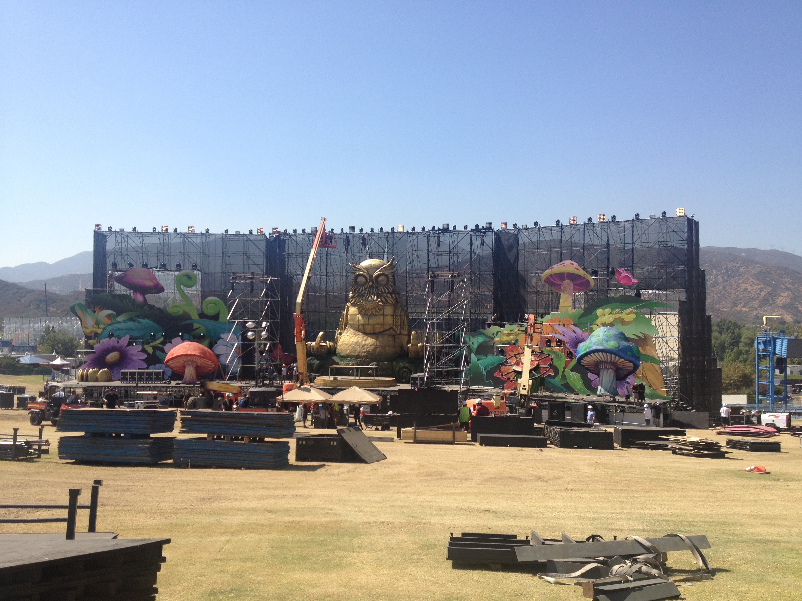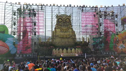 One of the stages that Mountain Productions’ engineered and built was the Sunken Garden stage at Nocturnal Wonderland. The roughly 80′ wide stage was flanked by two 56′ w sections of decking and scaffolding. Similar to the aesthetic of the Las Vegas EDC, there were many scenic flats adorning the scaffold walls and a nearly 43′ tall buddha owl featured as the central DJ platform of the stage. The flanking sides angled in to center stage and were fitted with black scrim. Like EDC at Vegas, Mountain supervisors utilized iPads to view the blueprints for construction. The advance in technology has allowed our drafting room to cut back on paper prints, saving 100s of feet of paper that would typically be used on multiple sets of drawings.