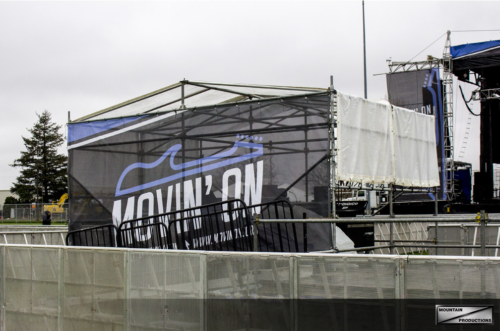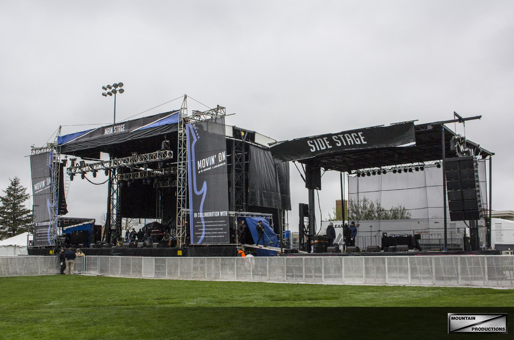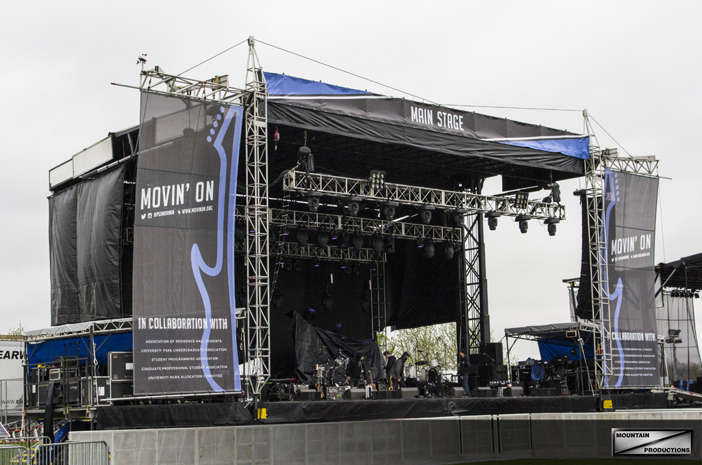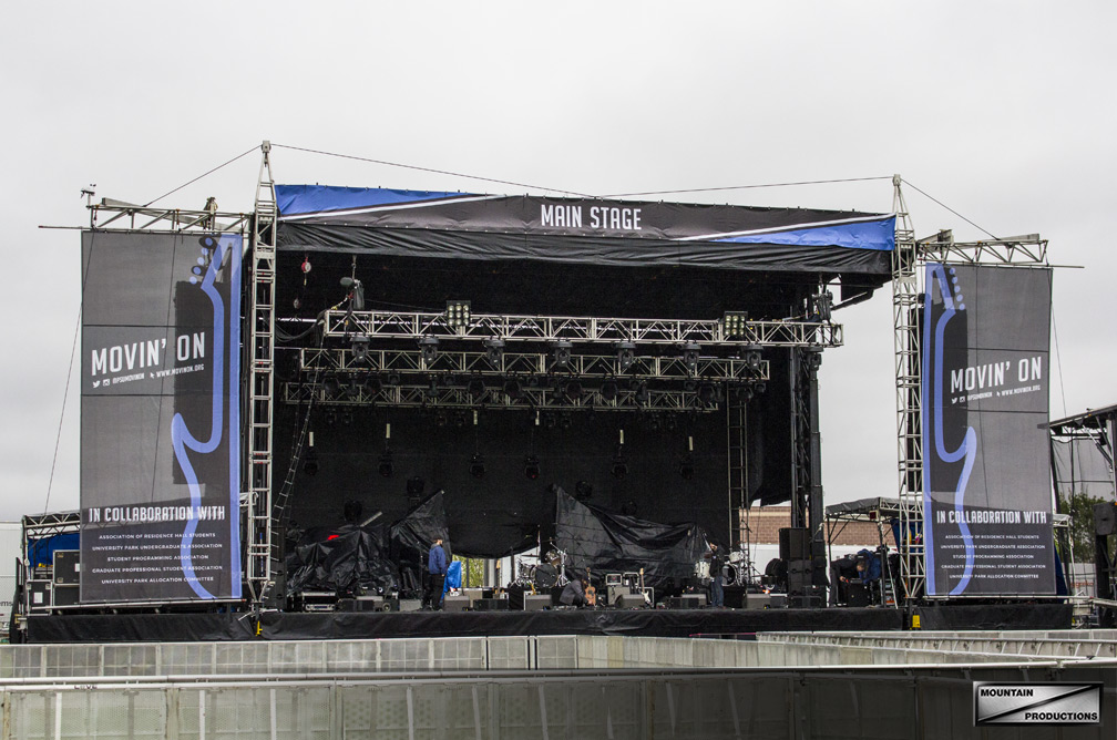 Mountain Productions provided a SAM-550 and SL-260 for the main and side stage, as well as a scaffold style front of house and crowd control aluminum barricade. The SAM-550 mobile stage is an impressive main stage structure that boasts the efficiency of mobile staging. Custom branded softgoods make a huge impact on overall brand cohesiveness, and Penn State’s Movin’ On graphics were proudly displayed on both stages, FOH, and around the campus. Take a look at some pictures from Movin’ On from right before the soundcheck. Congratulations to the PSU student body for organizing another year!
